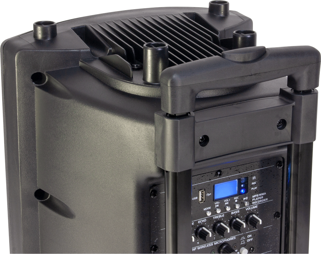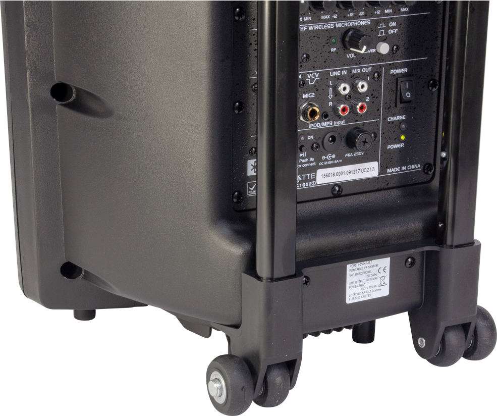 In addition to exceptional sound quality for its class, this portable system offers important features such as an included rechargeable battery and dual power supply (12V and 220V), a handle and wheels.
