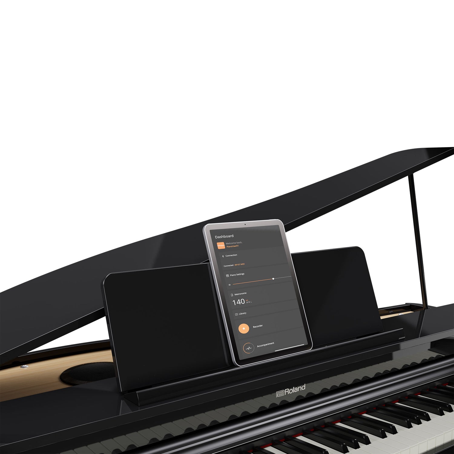 - The accompanying Roland Piano App allows you to control the GP-3's functions, view lessons and more.