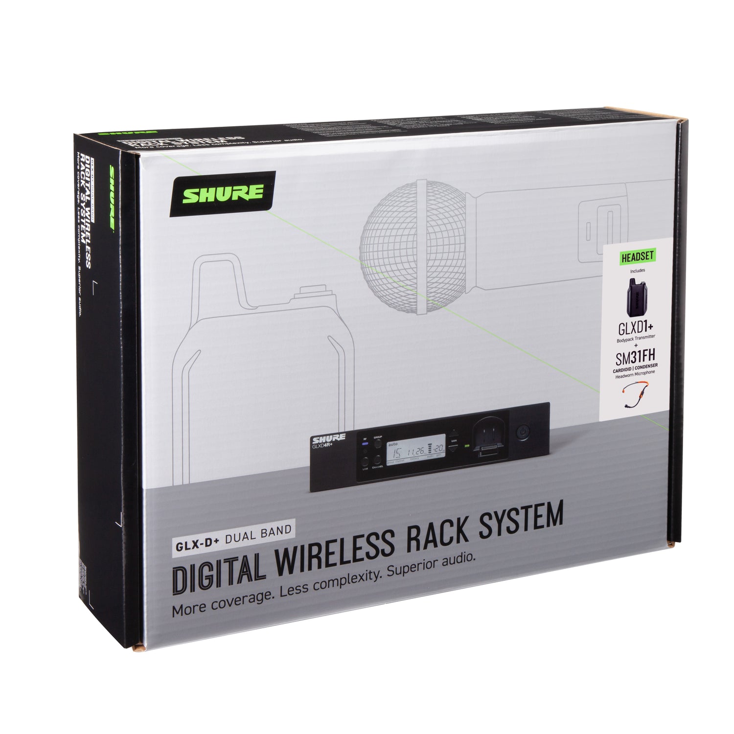 - Digital wireless rack system with SM31 headset condenser microphone, GLXD4R+ half-rack receiver and the solid GLXD1+ bodypack transmitter.