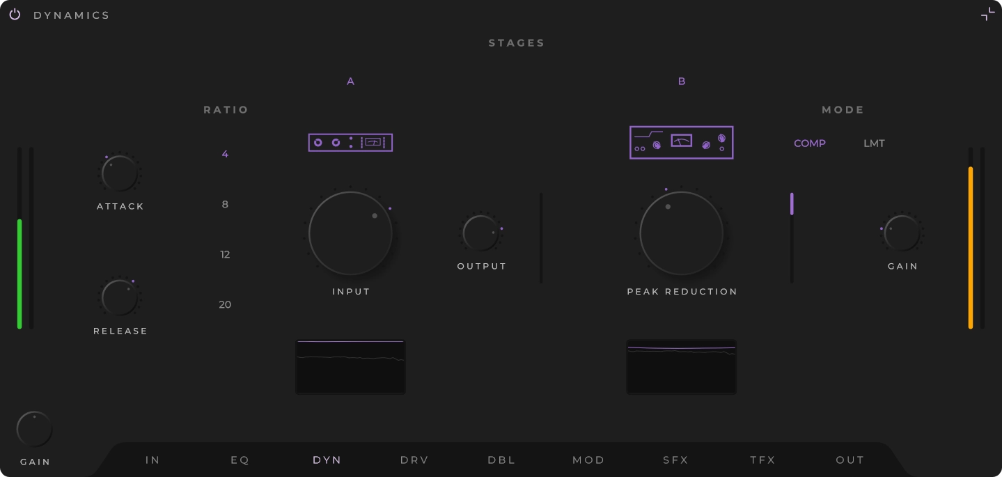 Dual compression engines modeled after distinct analog philosophies: a fast, peak-sensitive FET style for transient control, and a program-dependent optical style for smooth leveling. Configurable routing in series or parallel.