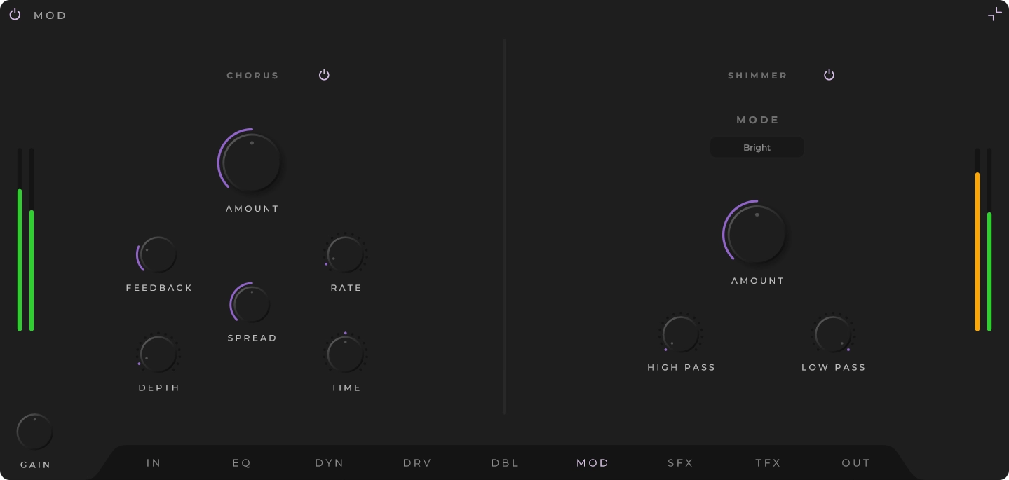 Chorus with adjustable depth, rate, and stereo spread. Shimmer reverb algorithm with three selectable tonal voicings, extending upper harmonic content.