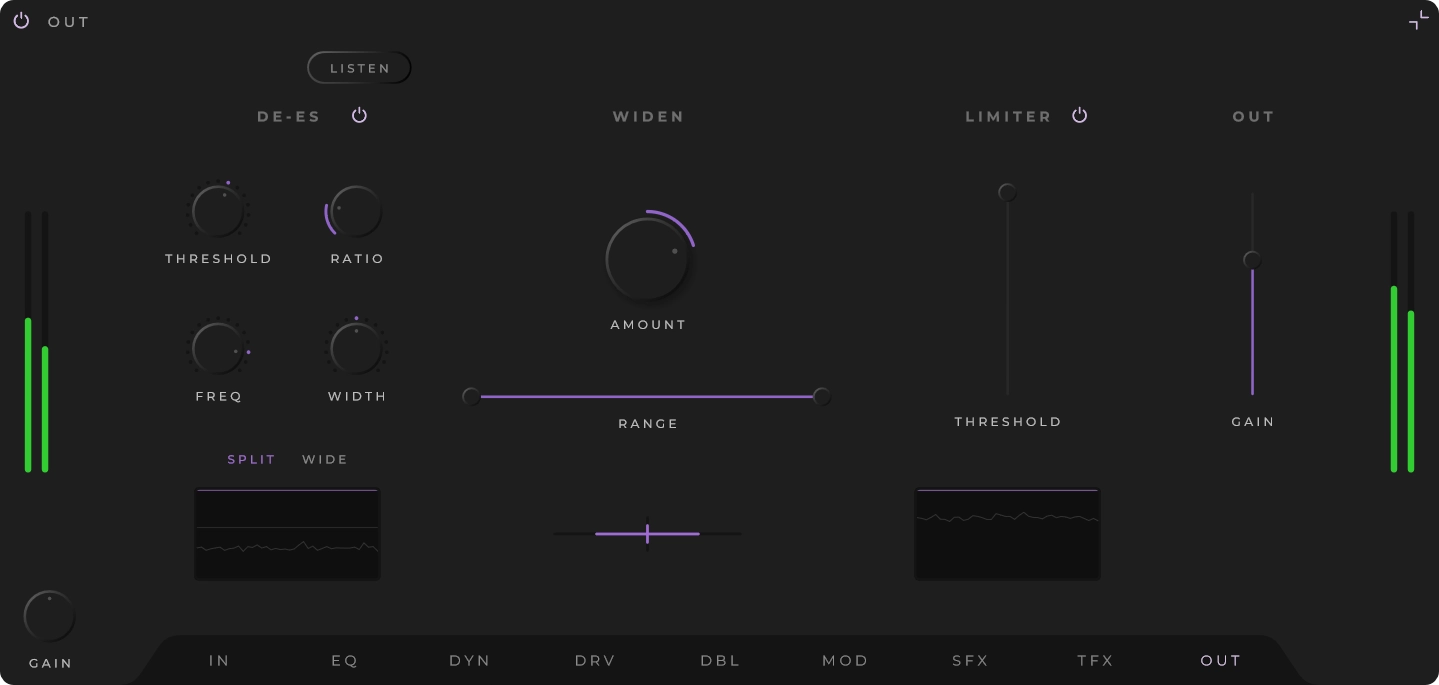Final processing includes a brickwall limiter, stereo widener, and output de-esser.