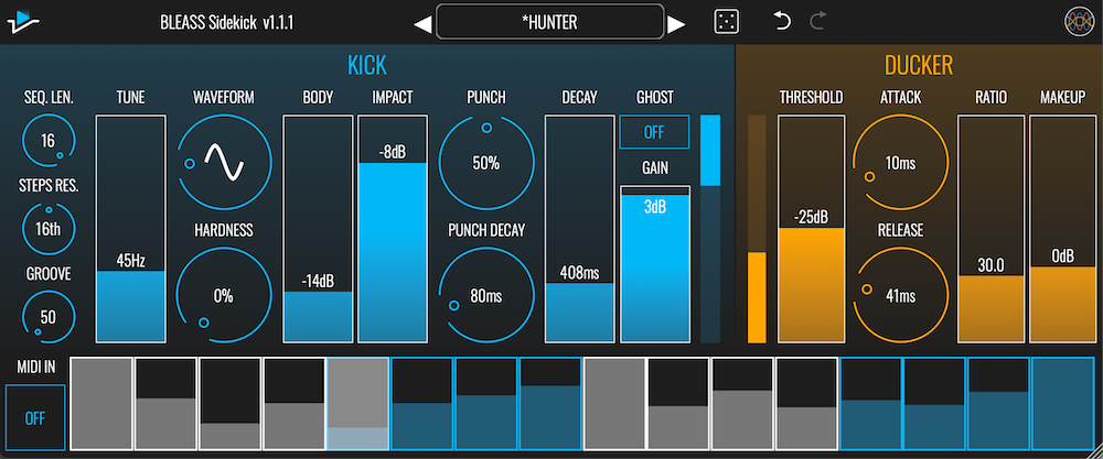 BLEASS Sidekick is a versatile plugin combining a kick drum synth, 16-step sequencer, and ducker for dynamic sidechain effects. Its analog-style kick engine, inspired by vintage beatboxes, crafts punchy, boomy kicks that can be mixed with the input signal or routed to a separate bus channel for further processing. The sequencer or MIDI input triggers precise rhythms, while the ducker creates pulsing effects. In Ghost mode, Sidekick excels by muting the kick to emulate sidechain compression, enabling creative mixing with rhythmic dynamics. Fine-tune threshold, attack, release, ratio, and makeup gain for precise control. With an intuitive interface, visual feedback, and low CPU usage, it’s perfect for electronic music producers crafting vibrant, professional tracks in EDM, techno, or hip-hop.