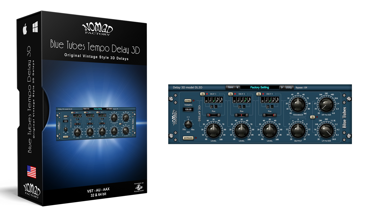 This delay provides three separate channels. Using the Pan controls, you can pan all three delay channels to the center, or spread the channels out across the stereo field (left, center, right). Gain controls set the levels for each channel individually.