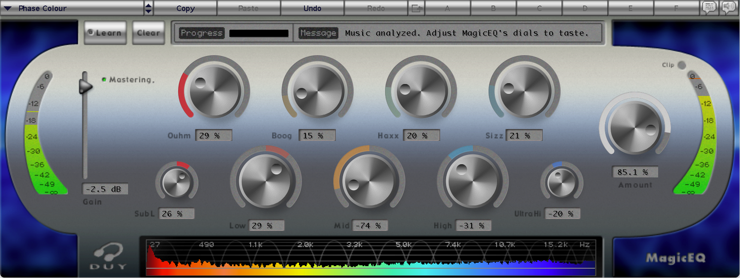 To use Duy MagicEQ, all you have to do is insert the plug-in, play your music and click on the "LEARN" button. Your music will analyzed during this initial step and will result in an auto-equalization. You can still modify many parameters after the EQ'ing has magically taken place. This is no standard EQ. Once MagicEQ has run through the song and analyzed it, all that's left to do is to tweak, finess the equalization and then MagicEQ will do the rest.
