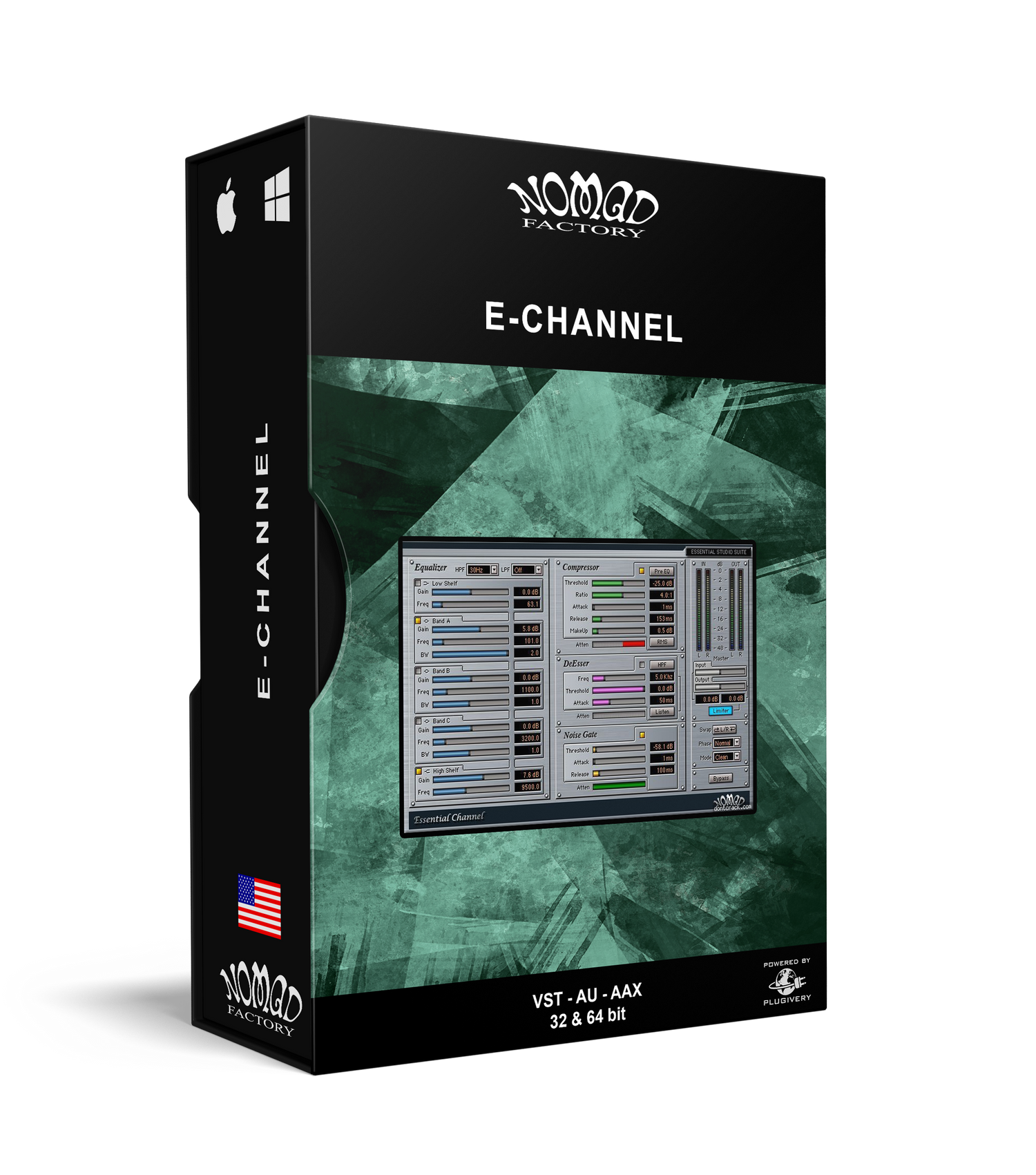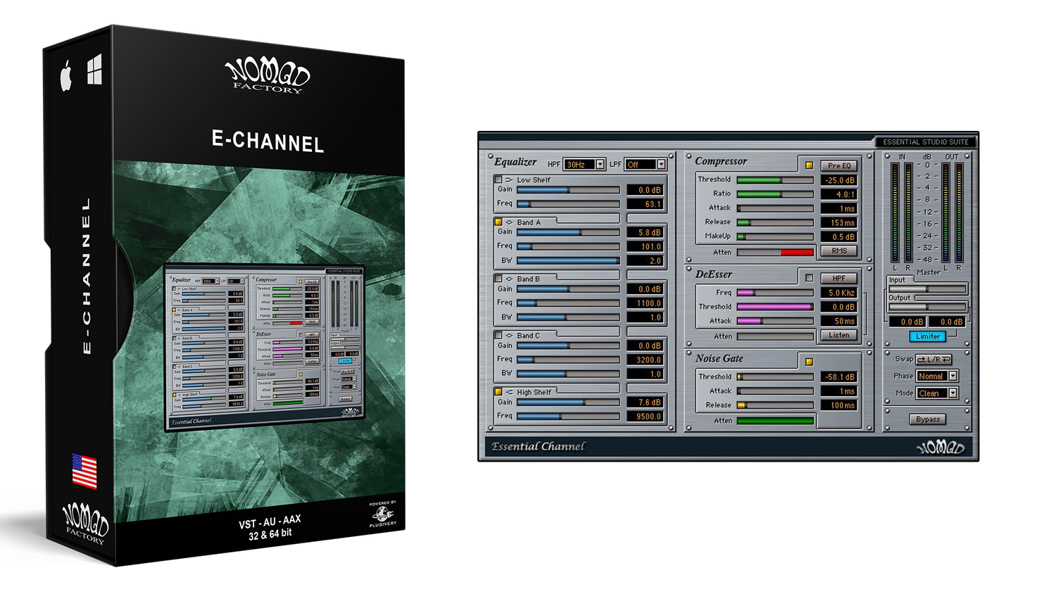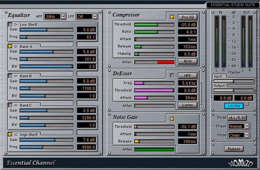 • 3-band parametric EQ, • High and Low Shelf filters, • High and Low Pass Filters, • Peak or RMS Compression (Pre- or Post EQ), • DeEsser (with selectable High-Pass or Band-Pass Filter), • Noise Gate, • and Brick-Wall Limiting.