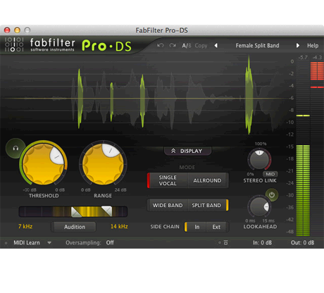 With its highly intelligent 'Single Vocal' detection algorithm, FabFilter Pro-DS accurately identifies sibilance in vocal recordings and attenuates it transparently.