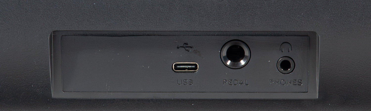 - Connection: USB-C power (USB-A cable included), sustain pedal (6.3 mm), headphone output (3.5 mm)