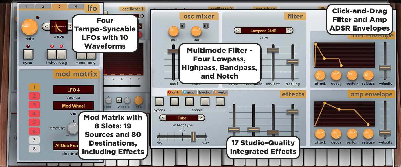 - Four tempo-syncable LFOs with ten waveforms, one-shot, retrigger, and mono or polyphonic modes