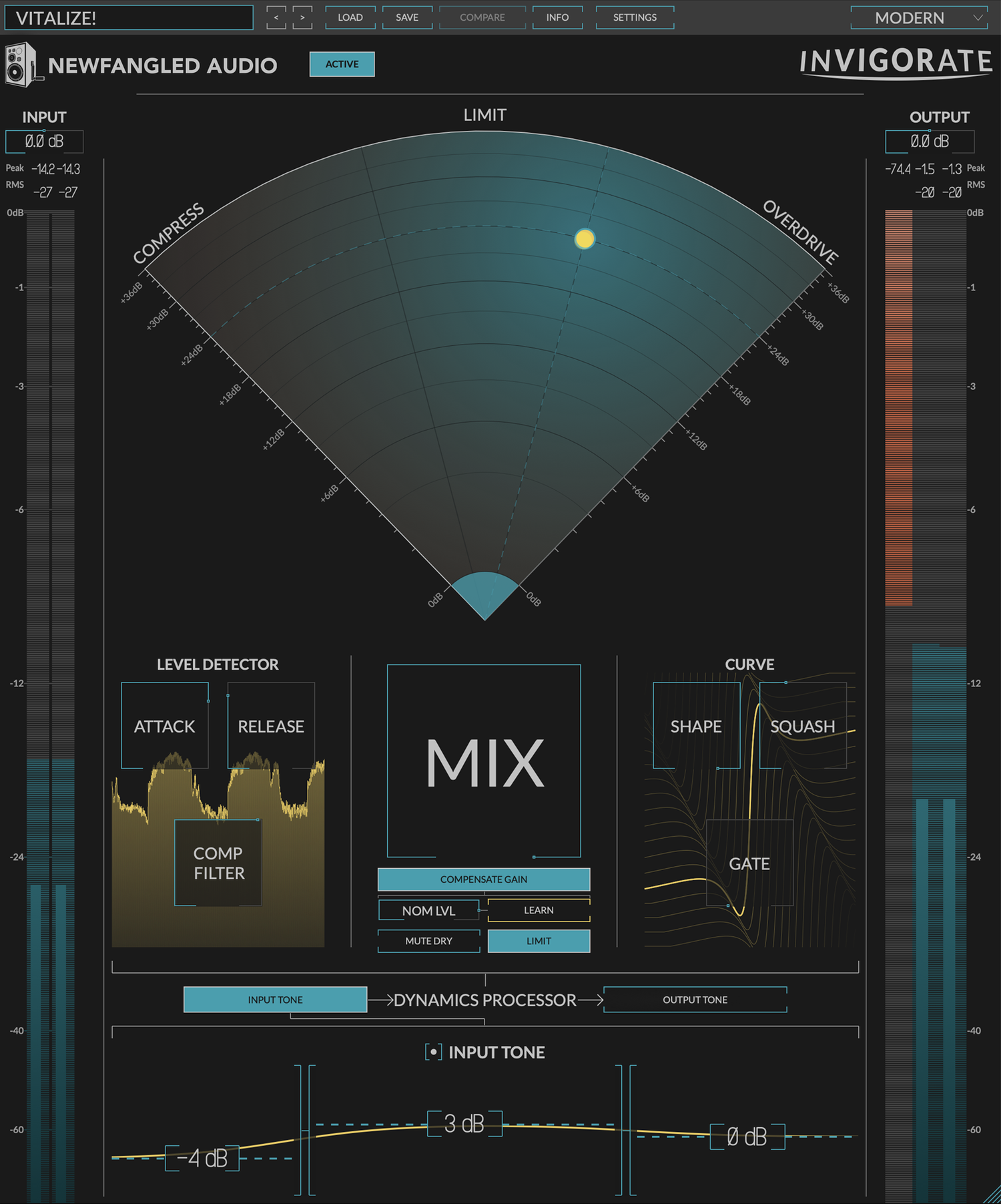 Here’s a little secret: compression, limiting, and overdrive are all the same thing—and all of them can be used to add energy and excitement to your music. Invigorate is a deconstructed compressor, limiter, and overdrive distortion fine-tuned to add life to your mix, drum bus, or any other element. The intuitive design allows you to effortlessly morph from pumping compression, through hard-hitting limiting, to rich distortion while dialing in the perfect sound with the prominent MIX control. The result is guaranteed to bring your mix forward and make it sound bigger.
