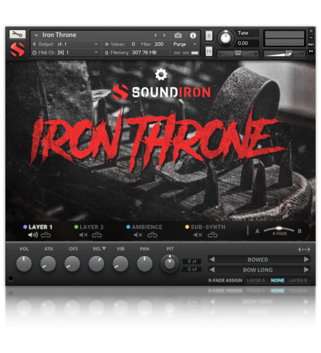 We used viola bows on the throne edges to create eerie melodic and dissonant tones. Several types of bowed instrument sets are included, including long sustains, medium gliss effects, short staccato, spiccato, and tremolo sustains. There are a number of different mallet rubs, brush, finger, and comb effects to explore. The finger drags, rubber ball, and flat mallet rubs were created by dragging the edge of the mallets (or fingers) along surfaces on the throne, in long arcs and lines. This caused it to resonate in a similar fashion to a rubbed gong. Mallet strikes were produced with wooden, felt, and metal tipped mallets and sticks to produce standard metal percussion sets. For Iron Throne 2.0, we created brand new ambiences, drones and atmospheric pads from the raw source recordings. This library also contains 20 new custom FX presets to give you instant inspiration for your next film/video game score, soundtrack or music composition.