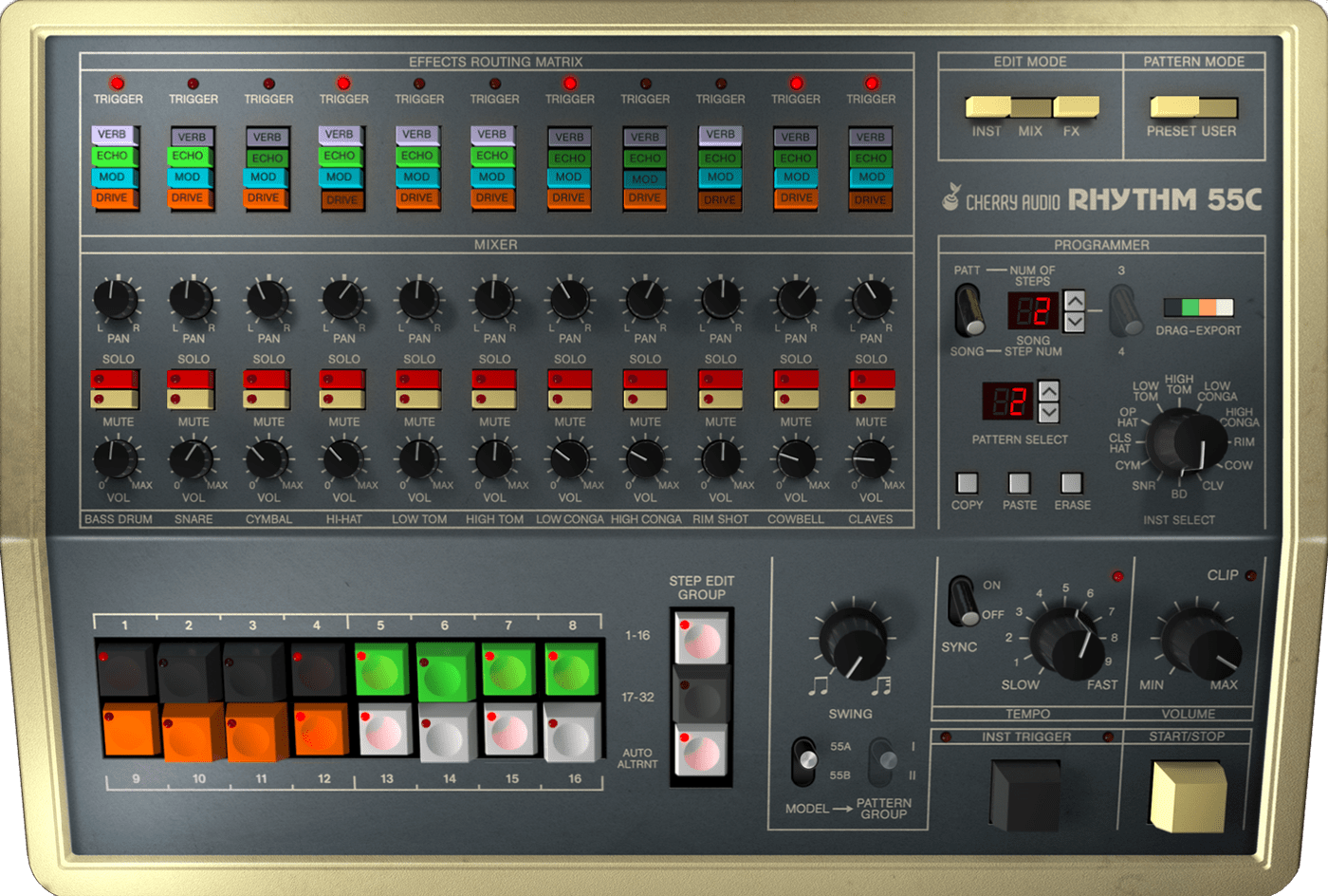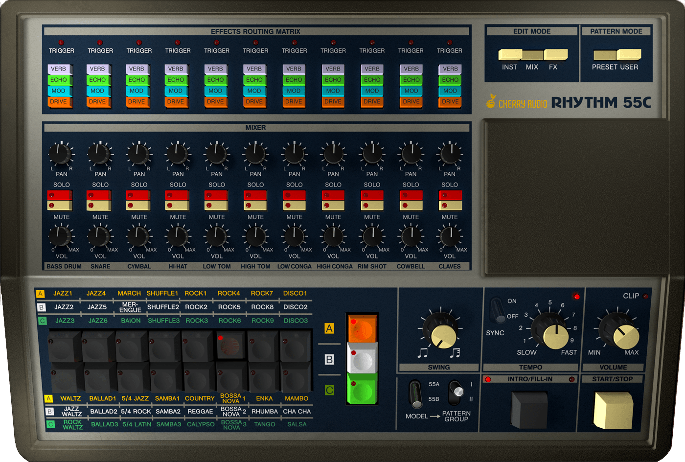 Cherry Audio's KR-55C is a supercharged, best-of-both-worlds software emulation that combines features from two lesser-known drum machines of the post-punk era: Korg's "Rhythm 55" KR-55A and KR-55B. KR-55C boasts all the rhythms from both models, for a total of 240 factory patterns, intros, and fills. Additionally, it adds 200 original patterns and kits that cover a wider range of genres. KR-55C's user interface shifts based on whether the A or B model is selected and includes extra pages that let this beatbox "step out" even further. It features a familiar X0X-style 16-button layout for step-editing and real-time pattern programming, as well as a song mode for chaining up to 99 patterns.