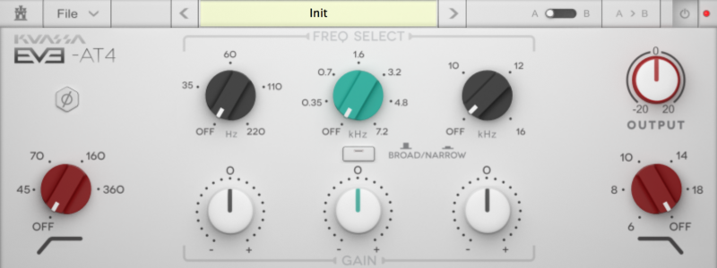 EVE-AT4 is a 3-band equalizer with an additional high-pass and low-pass filter. Designed as a tribute to the EQ section of the Neve* 1084, which was created as the successor to the legendary Neve* 1073. Although the EVE-AT4 possesses fewer bands, a smaller frequency selection palette, and less Q bandwidth selection options as compared to the EVE-AT1, its strength lies in its unique filter implementation, producing an idiosyncratic frequency response not present on the EVE-AT1. The result is a particular tonal character; the sound and tonal shape of its original incarnation is a hallmark of many classic recordings from the 70s.