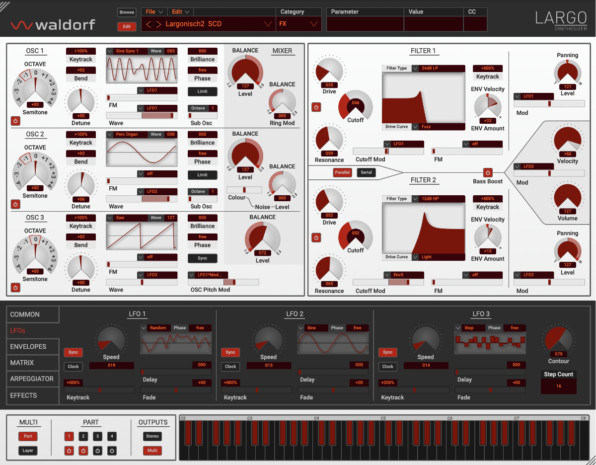 LFOs: 3 fast LFOs syncable to MIDI Clock and note retrigger with adjustable start phase, freely drawable LFO waveform with 16 steps (LFO3)