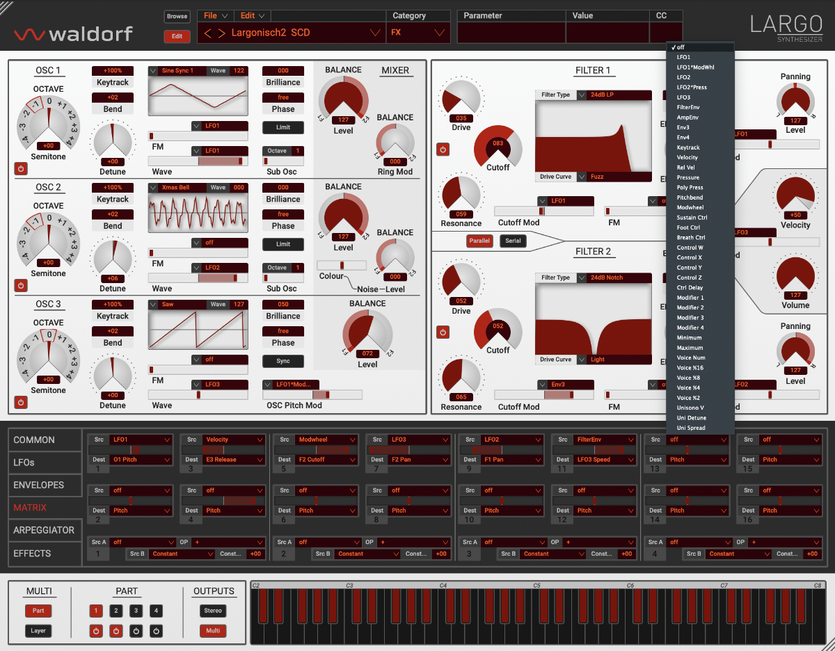 FILTER: Largo 2 offers 2 independent multimode filters and we have added a variety of 3 formant filter types which mimic the frequency response of the human vocal tract. By using the cutoff parameter you can morph between the vowels a-e-i-o-u for all your favorite choir and voice-like modulations.
