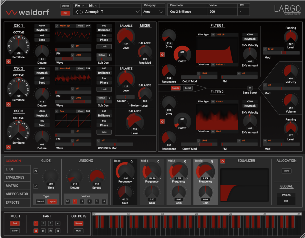 OSCILLATORS & WAVETABLES: 3 fat oscillators per voice (two of them with sub oscillators) with classic waveforms and 68 Wavetables taken from the legendary Microwave and Wave synthesizer as also Q and Blofeld. Up to 4 layers per sound and 4 stereo outputs