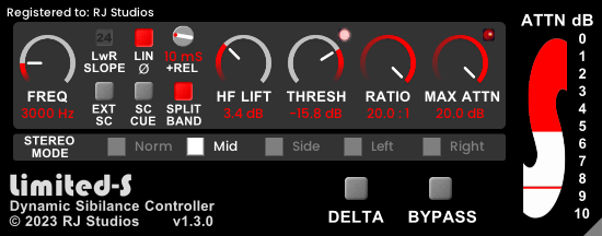 Limited-S is a “fixed threshold” type De-Esser that works on peak signal levels much like a limiter. It does not attempt to track the overall signal and attenuate what it “thinks” is excessive sibilance. De-Essers of that type tend to overcompress leading sibilance (producing lisping) while under-controlling trailing sibilance. Limited-S, instead, only catches the loudest and most offensive sibilance peaks. (The threshold can be automated if desired).When used on stereo tracks, Limited-S can operate on the full mix, just the Mids, just the Sides or just Left or Right. This allows applications in both mixing and mastering such as de-essing of vocals in a master (typically centered) while leaving the sides untouched. Limited-S’s High Lift control allows adding brightness to a mix while simultaneously controlling excessive high frequencies. Great on vocals or for brightening a master.