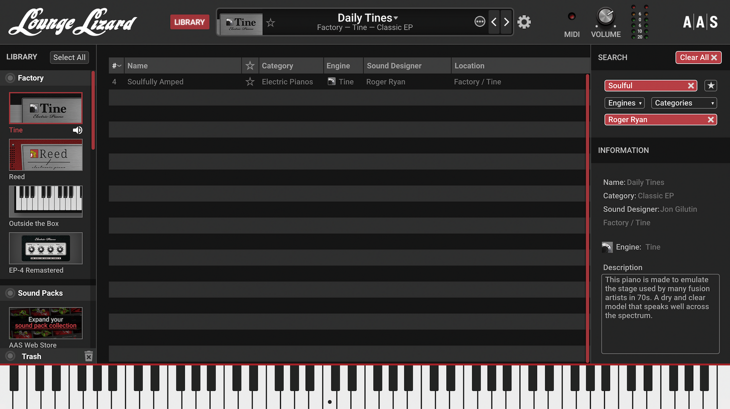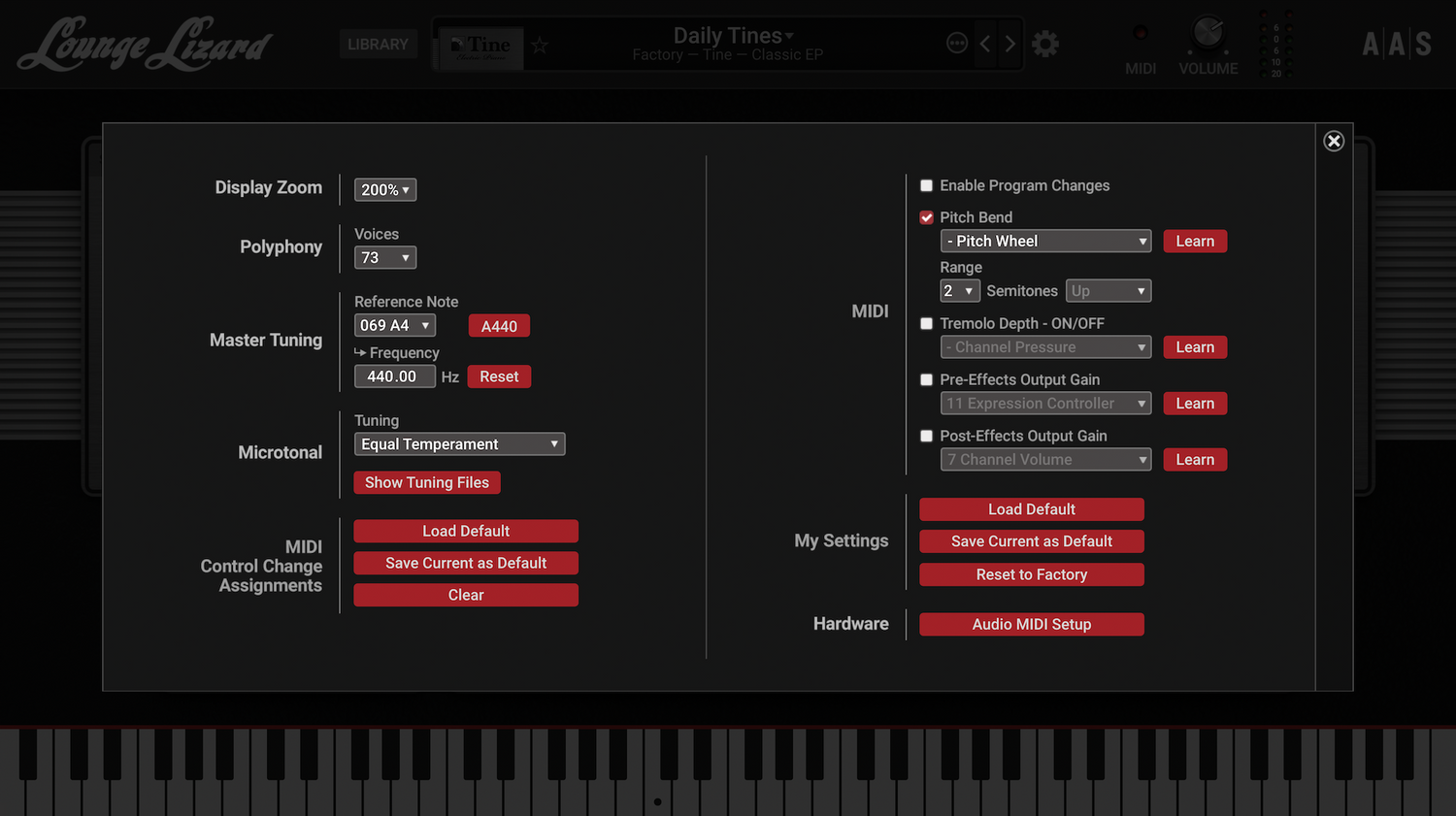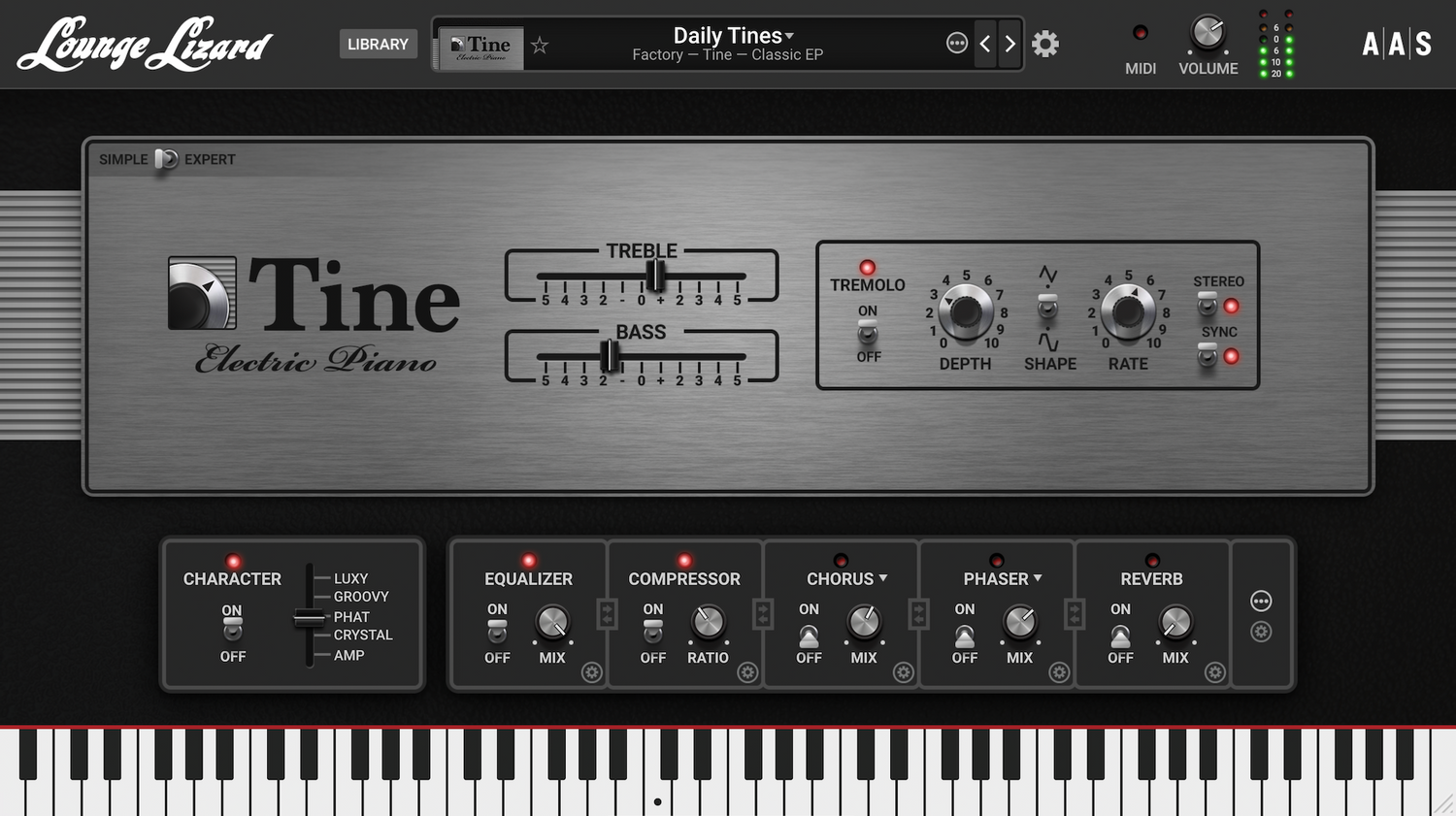 Modeled after the most sought-after vintage electric pianos, Lounge Lizard EP-5 is a complete solution that delivers the authentic tone, action, and feel of classic instruments. Since its first release in 2002, the award-winning Lounge Lizard has continually evolved—now featuring a dedicated synthesis engine for both tine-based and reed-based models.