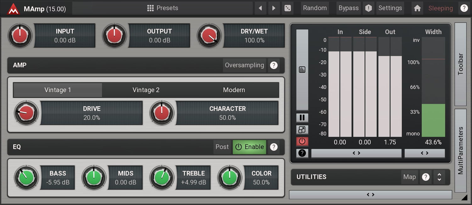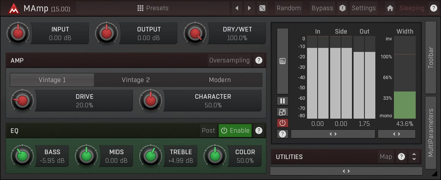 MAmp is a great sounding vintage amp. Whether you are looking for soft saturation to enhance the harmonic content or great sounding distortion : MAmp is the perfect tool for the job.