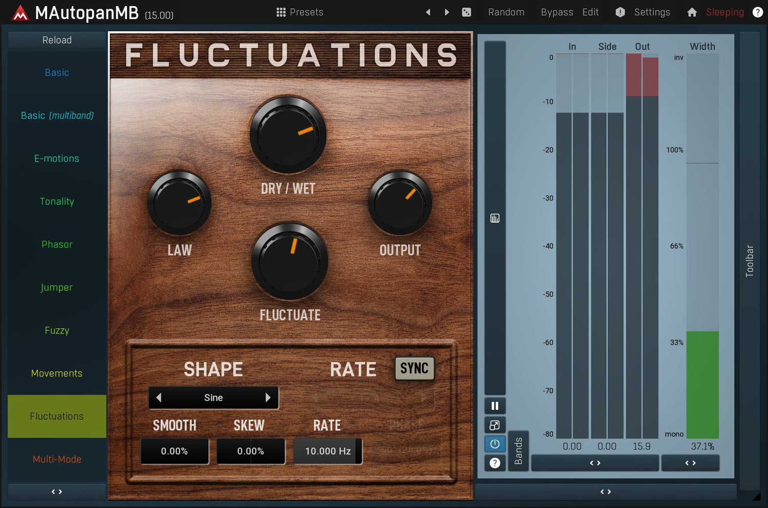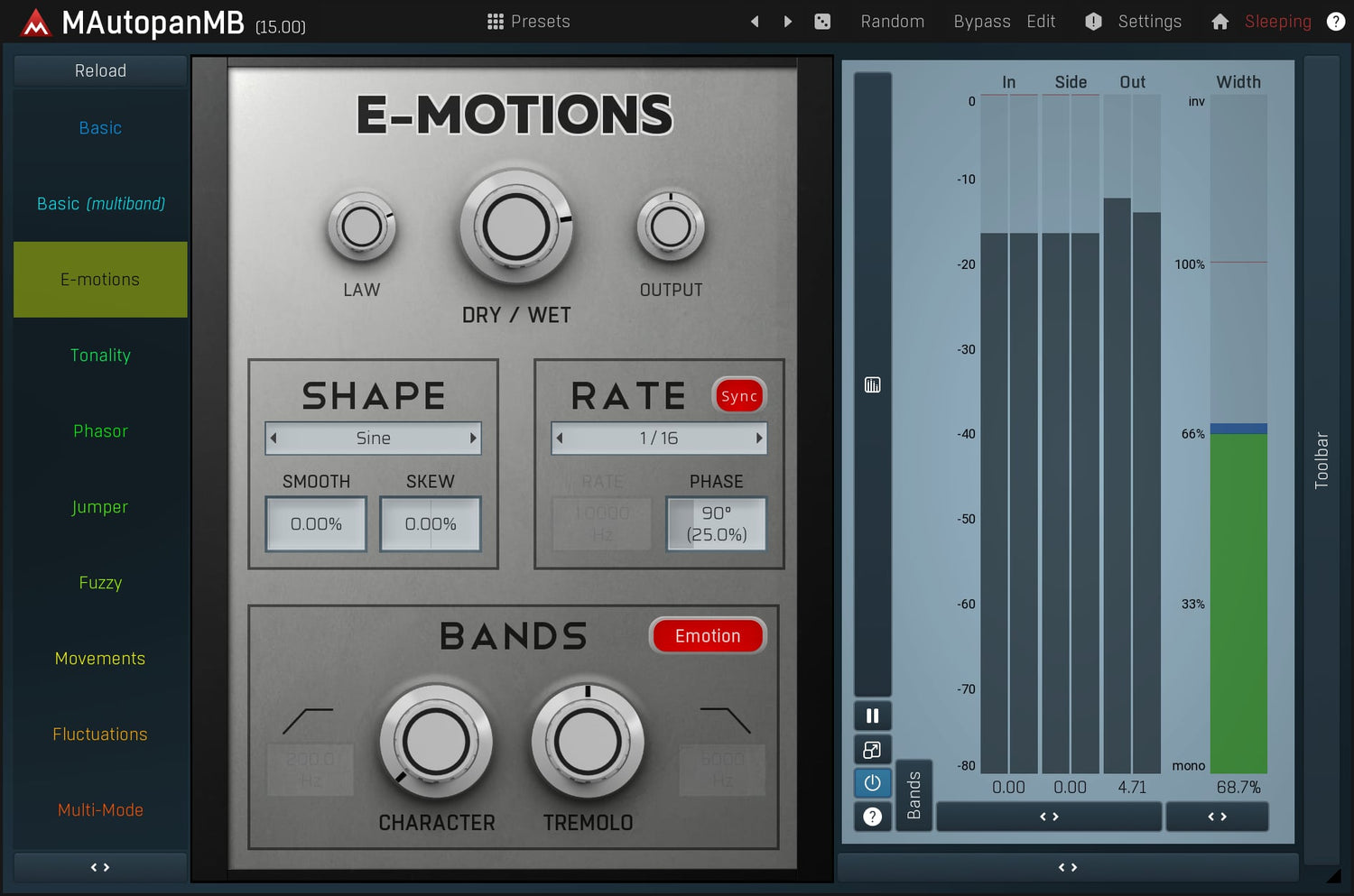 MAutopanMB, the most powerful automatic panner in the world, is the cure whenever you need to make some audio material more spatial and less static. It's an indispensable tool for keyboards, guitars and many other mono instruments.