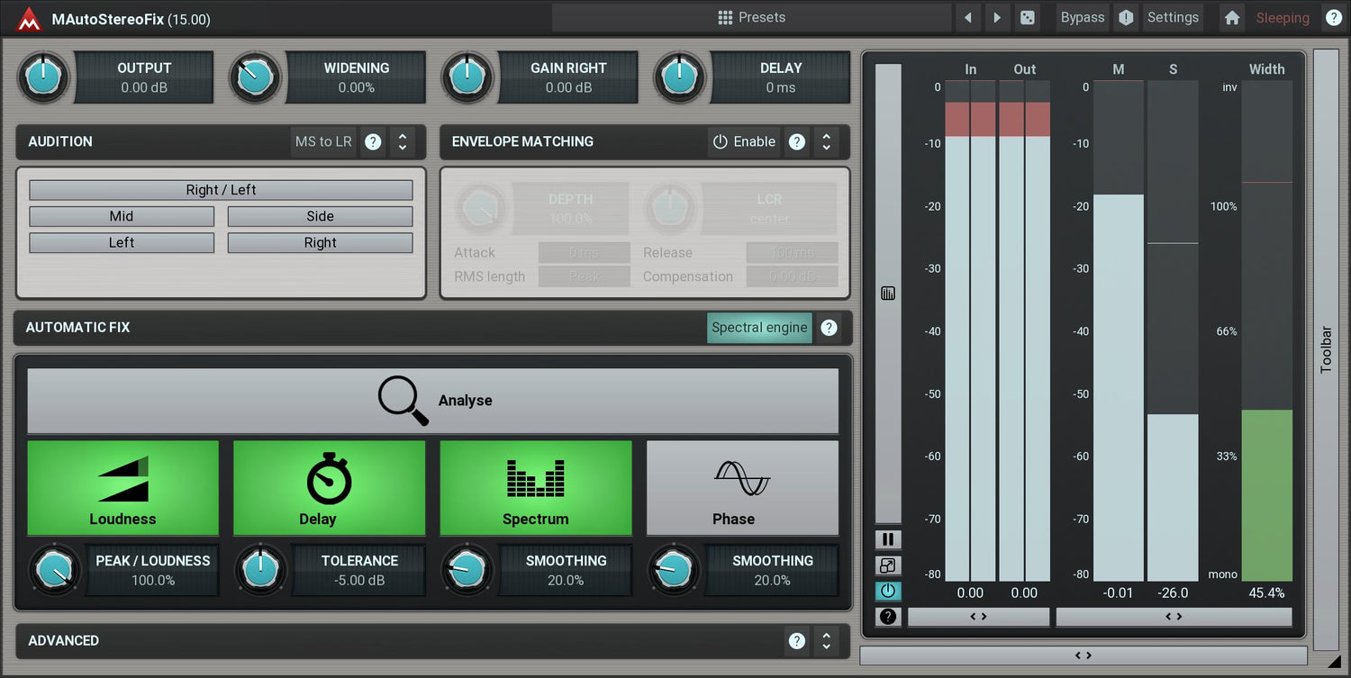 MAutoStereoFix is a magical tool, that fixes problems in stereo recordings even if you didn't even know there are any! It has been designed for stereo microphone recordings such as overheads and rooms, but can be used on master tracks as well.