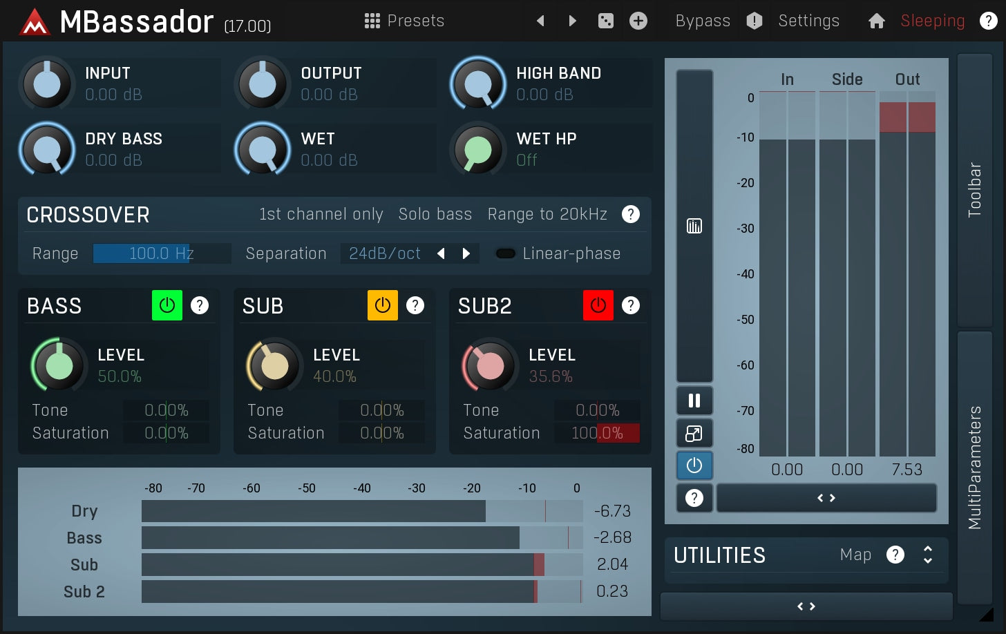 Not many people have the access to the studio equipment we use when mixing. That's especially true when it comes to reproducing bass and subbass spectrum. The first module in MBassador lets you post-process the bass content so that it is stable and tight and contains higher harmonics, so that it is audible even when played on a cheap pair of headphones so many listeners use these days.