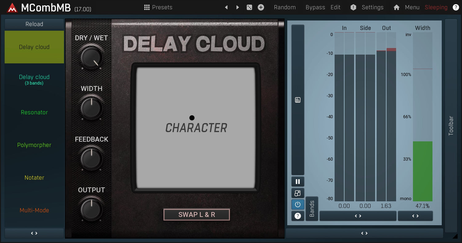 With MCombMB you have up to six separate bands, each with up to 4 filters. You can arrange them in series, in parallel, or just mix it somehow. Each filter has an adjustable feedback with band pass and even a limiter! You can also invert phase in each channel to get quite some unique stereo width. And most of that is easily accessible using the easy-to-use graphical editor. And that is just a beginning...