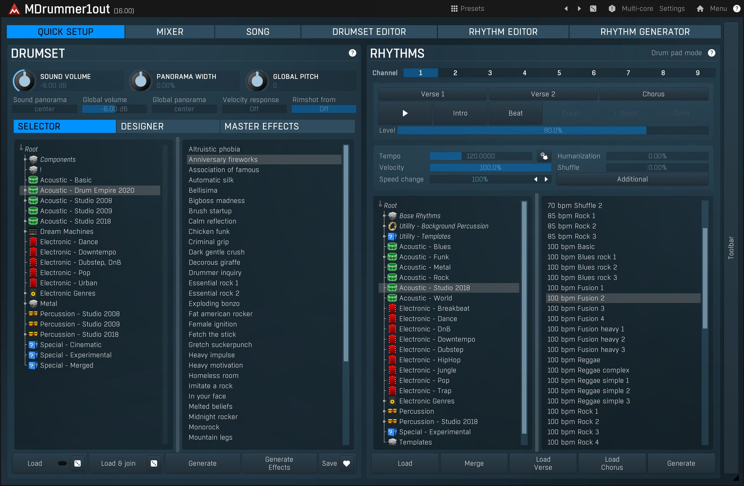 MDrummer truly understands what a rhythm is in the same way that humans do and you have access to everything it knows. It can cover any style and any percussive instrument. MDrummer can play pop, drum'n'bass, rock, r'n'b, salsa, jungle, jazz, rumba on congas, progress-metal in 11/4 signature... anything you can imagine. MDrummer can generate new rhythms for you, merge multiple rhythms, add shakers and other background percussion. Humanization, shuffling, half/double tempo & feel and many more advanced features let you transform your ideas into reality with a few mouse clicks.