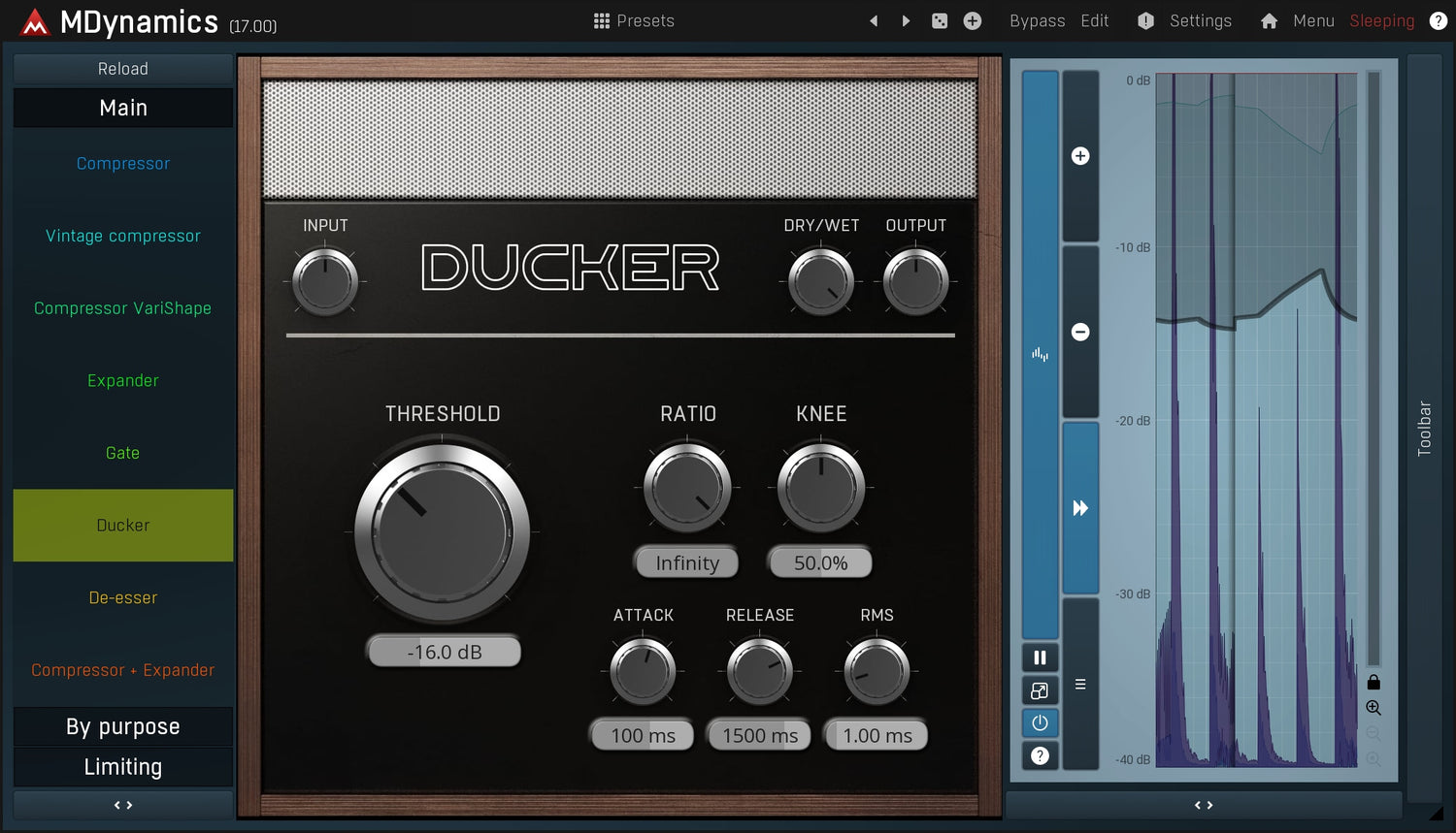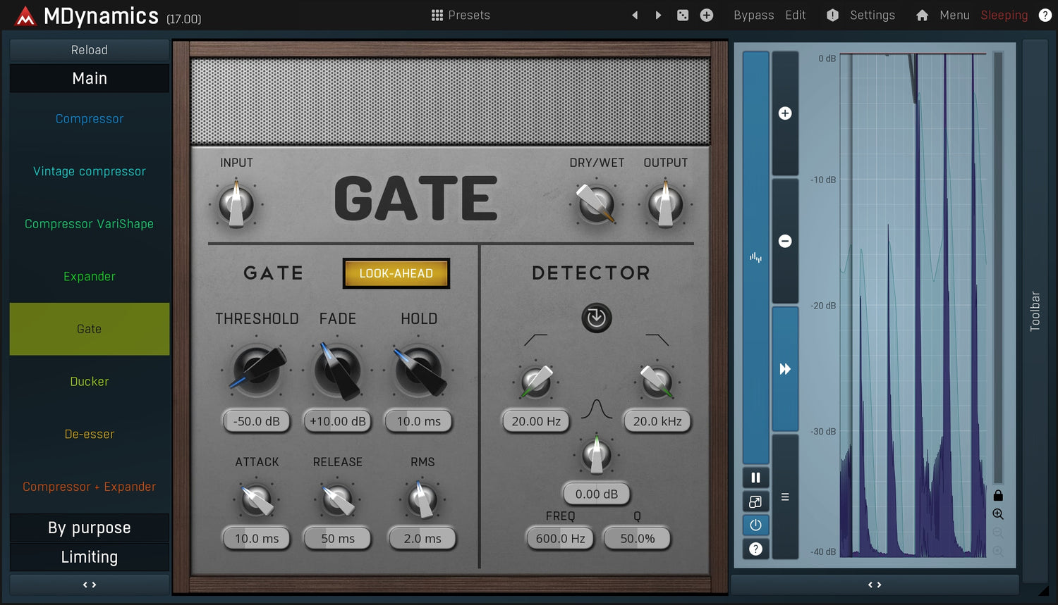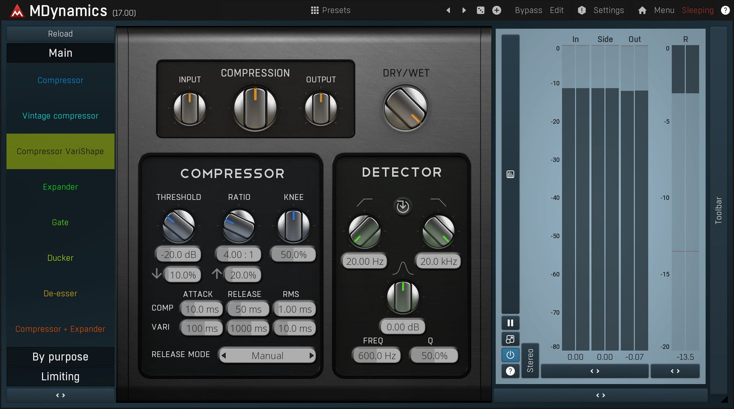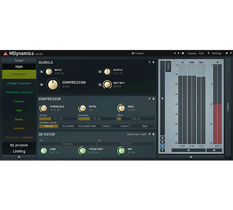 MDynamics can adapt to any audio material thanks to its extremely versatile envelope follower featuring automatic release modes, peak hold, RMS length, look-ahead, psycho-acoustic pre-filtering, custom attack and release shapes, spectral smoothing plus much more.