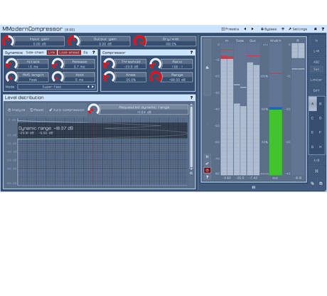 MModernCompressor of course provides the typical control parameters, gain reduction, output peak and loudness values, but it also shows a level distribution graph, from which the plugin can analyse the signal and actually setup compressor parameters automatically!