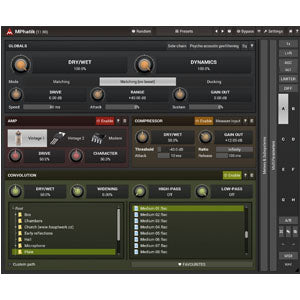MPhatik comes equipped with a powerful amp simulator, convolution reverb (featuring all kinds of impulse responses from plate reverbs to halls, rooms etc., or your own IR files of course) and a compressor. If that's not enough, you can also use the side-chain input to drive MPhatik and process the audio with your own tools, leaving MPhatik to restore the dynamics.