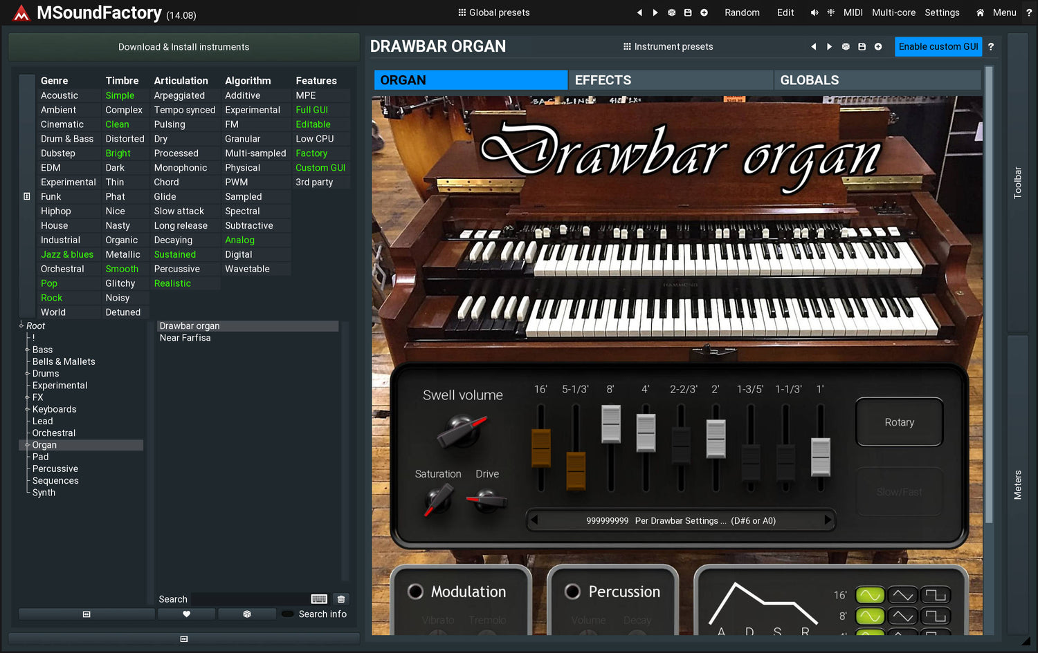 Remember what garbage can produce a distortion of an oscillator once you play a chord? No more! MSoundFactory actually lets you instantiate many effects per-voice. And there's everything from distortions to reverbs, delays, equalizers, modulation effects...