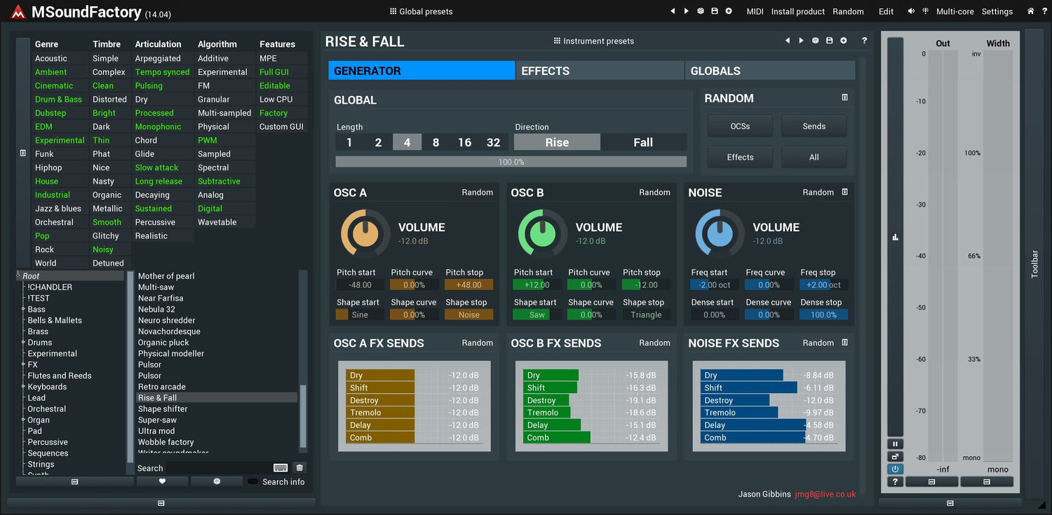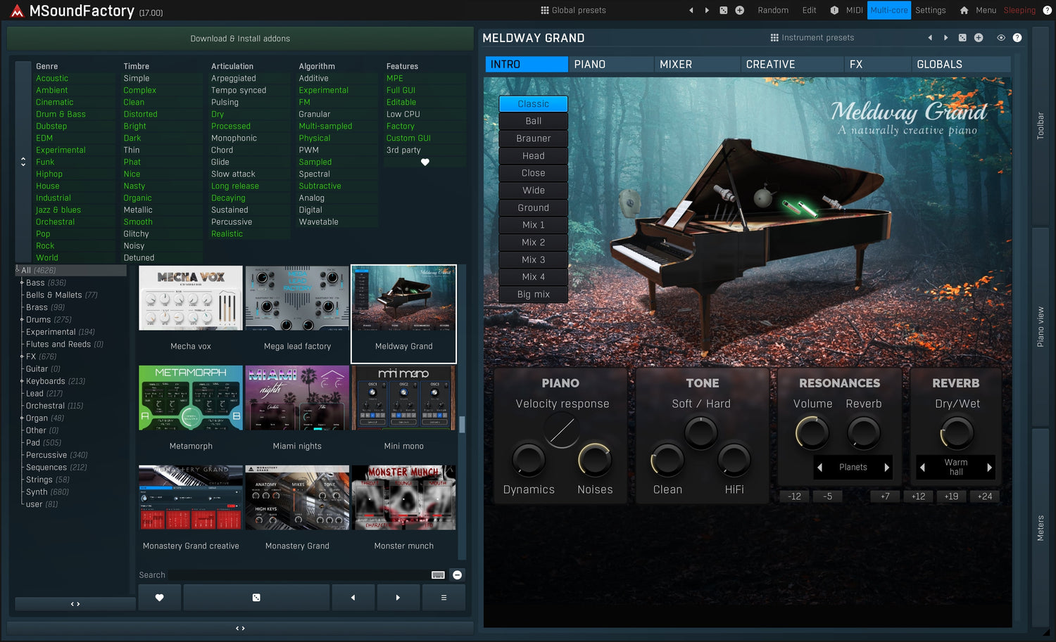 MSoundFactory provides hundreds of predefined sounds available via global presets, just as any other instrument. The true marvel however is the categorized system of instruments. An instrument is not just a sound, potentially with a few macro controls. It is an entire "instrument", with lots of settings and its own presets.