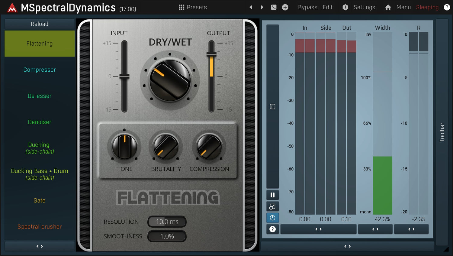 MSpectralDynamics is a true revolution in audio processing. It can flatten the spectrum, prevent collisions between tracks, remove noise, and open up myriad new creative possibilities.