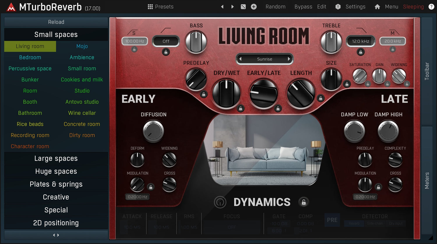 Algorithmic reverbs are usually based on a single algorithm. But MTurboReverb comes up with a revolutionary programmable engine, where you can design your own algorithms, but most importantly about 100 of them have already been prepared for you, with a standardized GUI for extremely quick workflow and short learning curve. There is everything from rooms to halls, plates, ethereal and shimmering sounds, and 2D positioning reverbs.