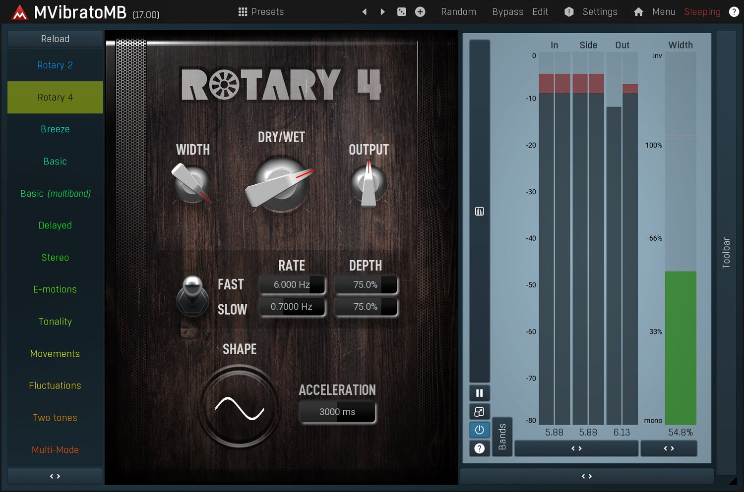 MVibratoMB combines the vibrato effect with a tremolo and multiband design. This provides enough power to build a 2-speaker rotary simulation, like the famous Leslie speaker. But why to stop there, when you can have a 6-band rotary! With up to 16x upsampling and sinc-interpolation MVibratoMB is simply the best sounding rotary simulator on the market.