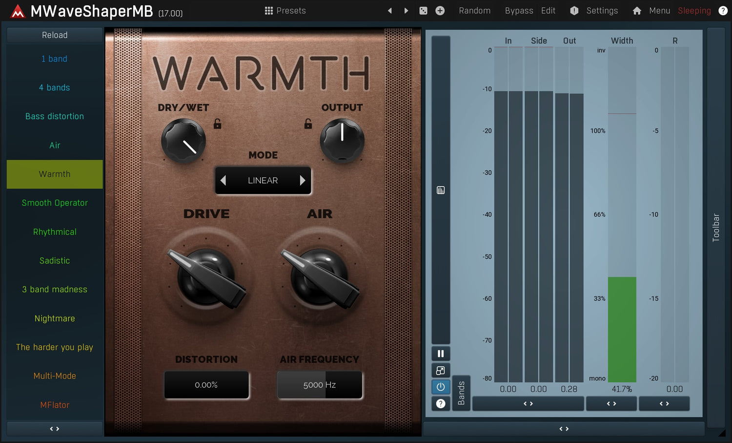 Waveshaping a broadband signal may be useful, but it's usually too overpowering and doesn't give you many options. MWaveShaperMB lets you split the input signal into up to 6 bands and use a different custom shape in each of them. You can even modulate the shapes for real distorted madness.