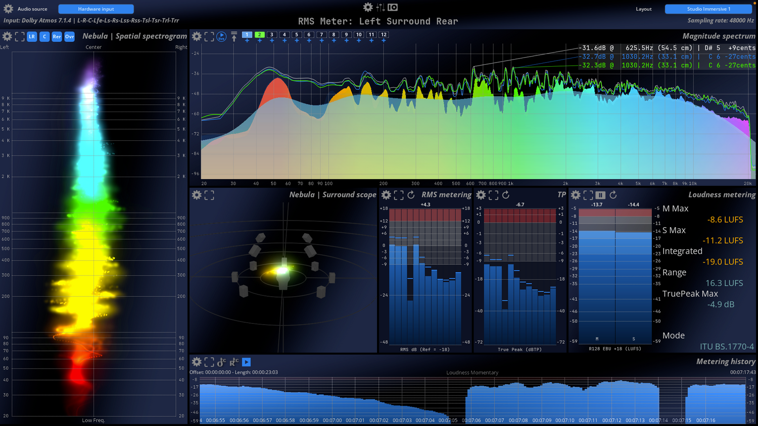 The unique FLUX:: Nebula visualizes the spatial sound field in a scope spectrogram for multichannel analysis in up to 24 channels.