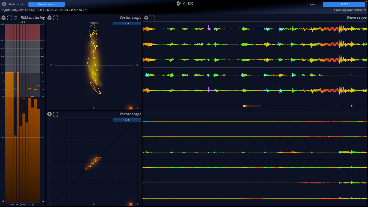 Mix with confidence and be in full control, in a reactive, real-time environment. MiRA Studio is the first immersive audio analyzer with support for up to 24 channels for workflows in Dolby® Atmos, Auro3D, NHK 22.2, and other multichannel formats and speaker arrangements, featuring customizable layouts and workspaces tailored to your specific needs.