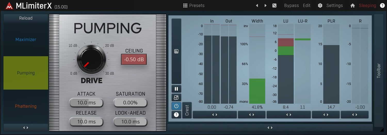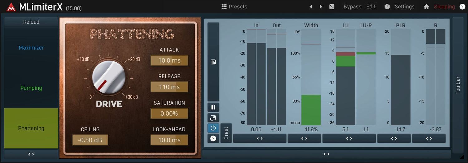 A limiter is an essential tool for every mixing and mastering engineer. If you are looking for the big guns that can make your recordings sound louder while keeping transparency, but add character if you ask for it, MLimiterX is the weapon for you!