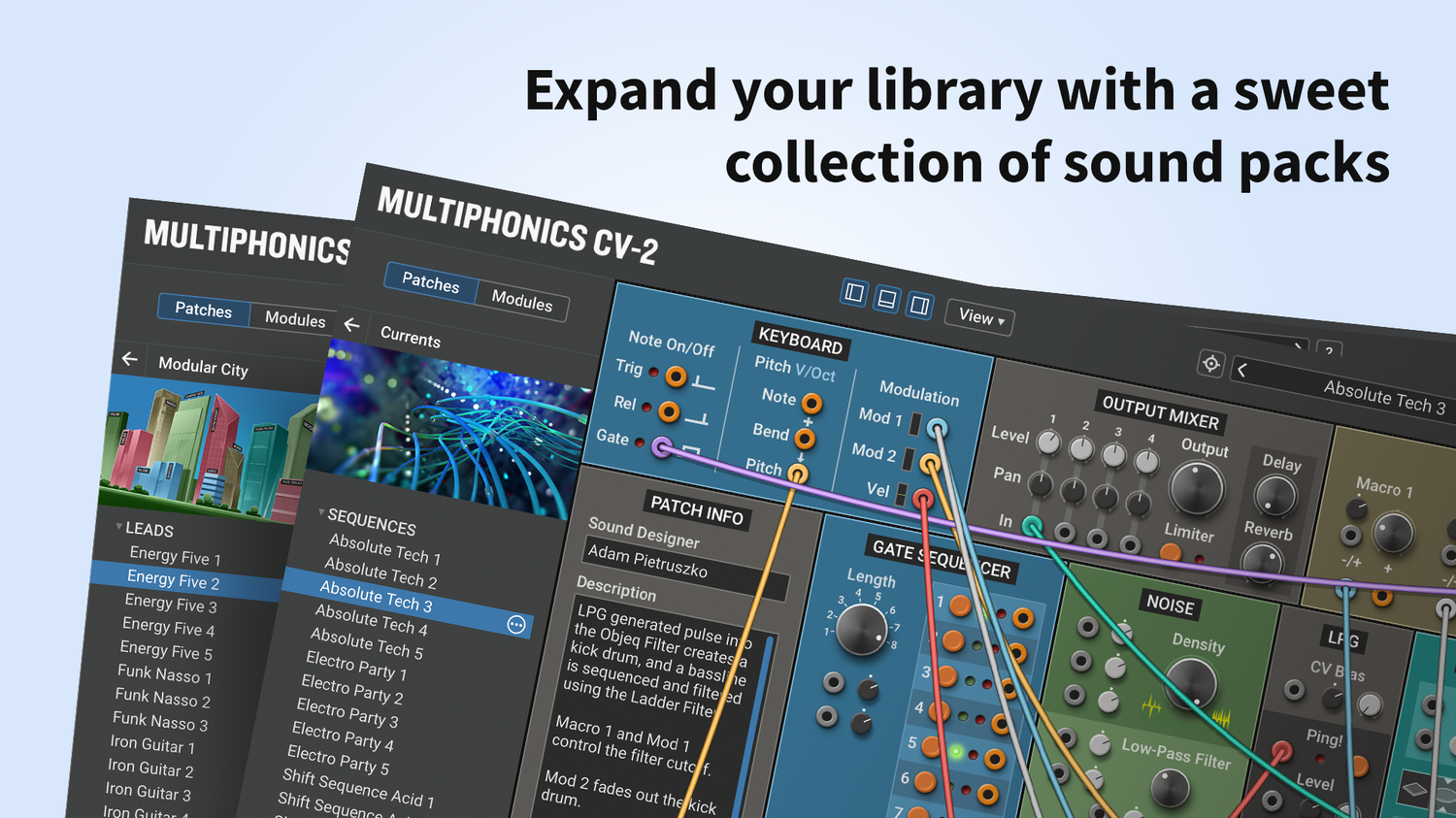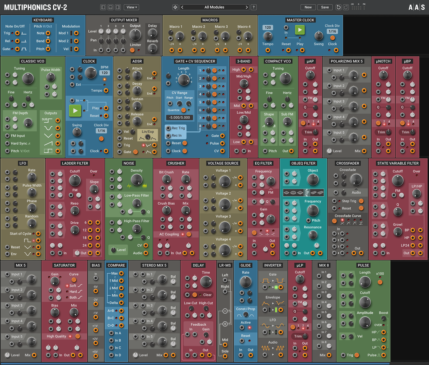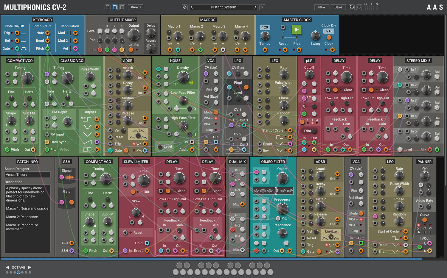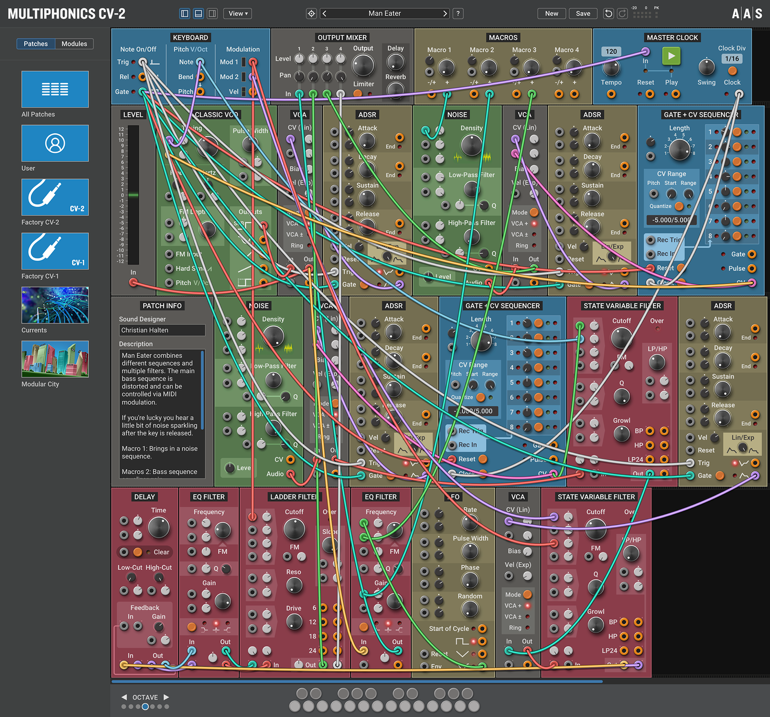 Multiphonics CV-2 is a versatile modular platform for assembling and playing patches. With a simple and straightforward interface, Multiphonics is a fast and efficient creation tool for musicians and sound designers. It is also a great learning environment for newcomers. At the core of Multiphonics is a comprehensive library of modules, from the basics to unique and sophisticated originals, and a vast and inspiring library of patches crafted by top sound designers.