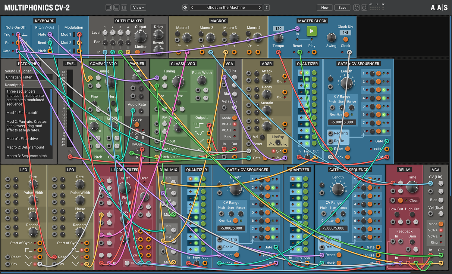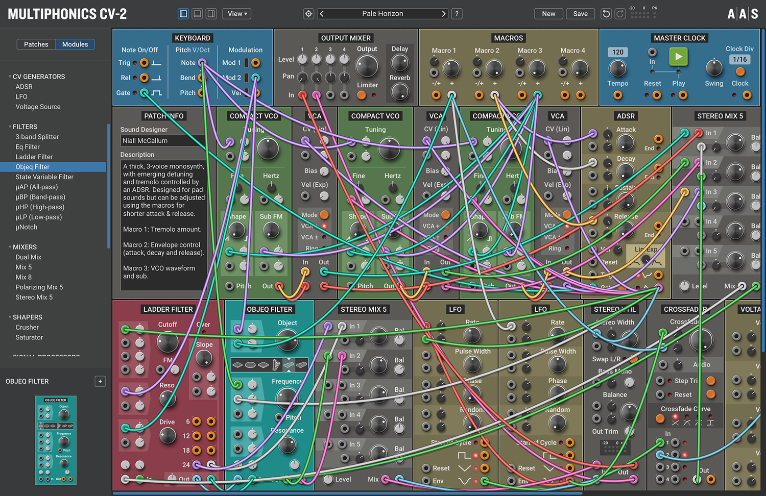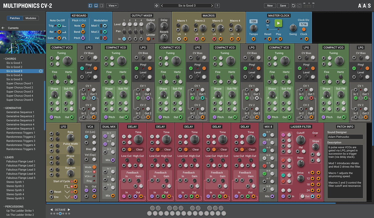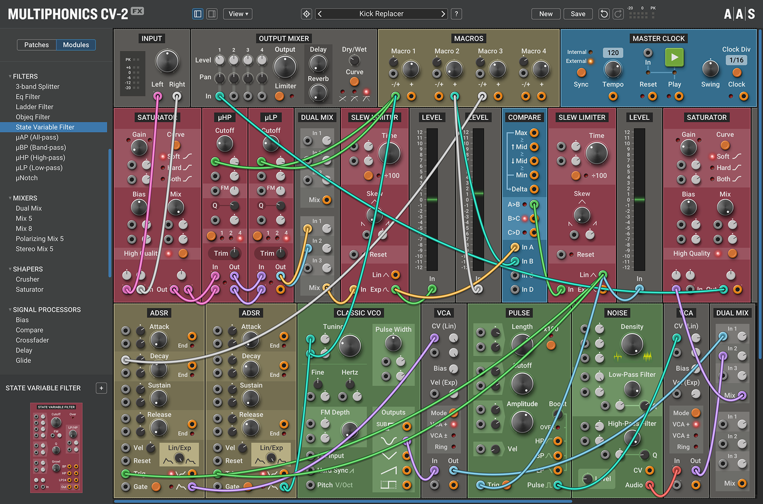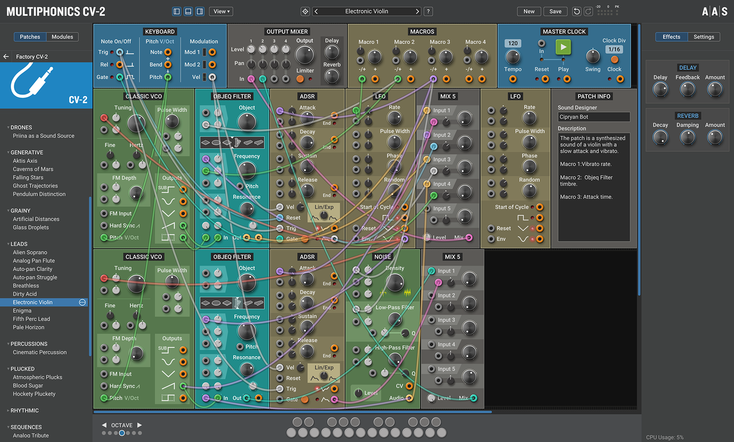 Multiphonics CV-2 is a versatile modular platform for assembling and playing patches. With a simple and straightforward interface, Multiphonics is a fast and efficient creation tool for musicians and sound designers. It is also a great learning environment for newcomers. At the core of Multiphonics is a comprehensive library of modules, from the basics to unique and sophisticated originals, and a vast and inspiring library of patches crafted by top sound designers.