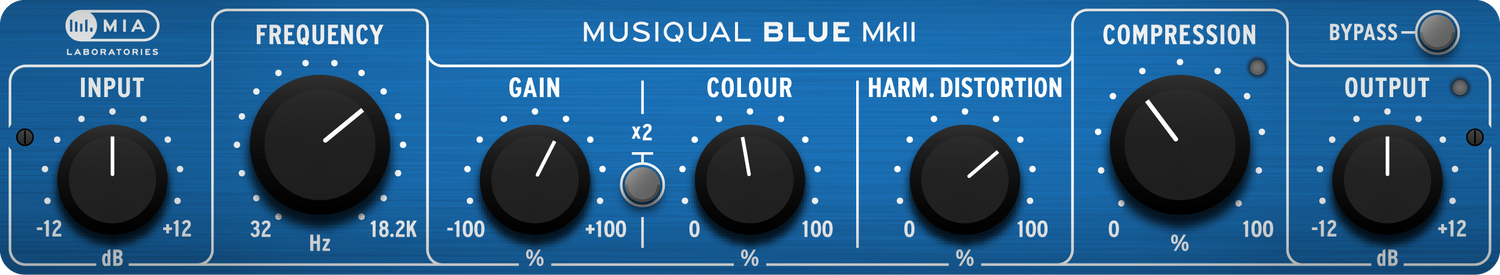 The Compressor within Musiqual Blue is specifically tuned to complement the Class A character of this unit. It has a fixed attack and release settings and allows for easy control of the amount of compression applied to the sound.