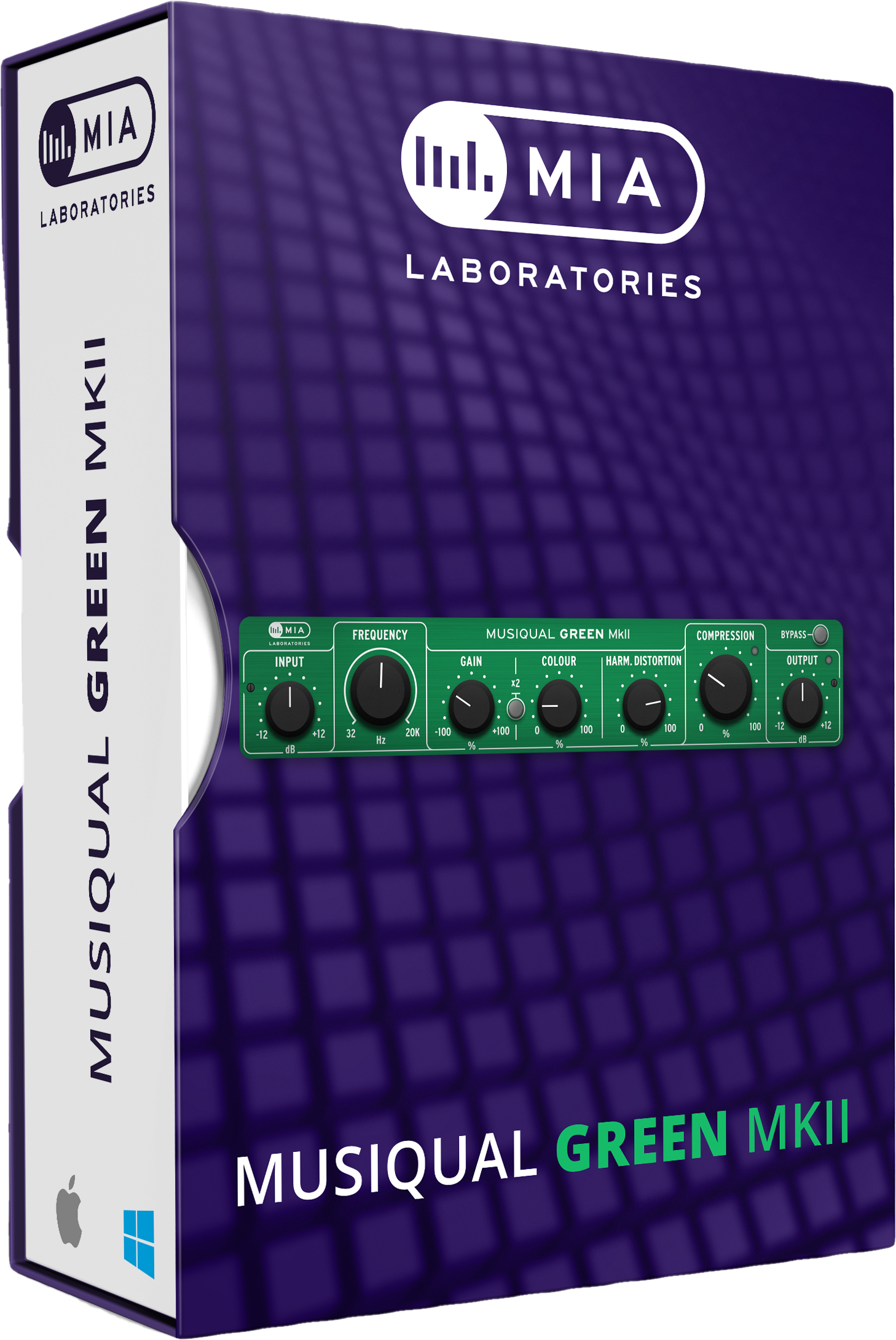 Musiqual Green’s EQ provides a fairly transparent sound with a "Transistor" flavour very much characteristical of analog technology. The user has complete control in the 20Hz – 20kHz range, since there are no specific, predetermined bands as in the other Musiqual tools. Its “Colour” is soft and discrete. The transistor or op-amp circuit amplifiers demonstrate a strong component of “3rd order harmonic distortion”. The Harmonic Distortion component in the Musiqual Green simulates this characteristic sound, it introduces odd harmonics, with the 3rd one being the most prominent. The user can precisely tune the amount of distortion added to the signal.