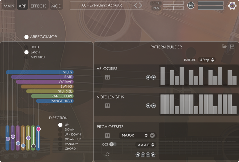- Fully customizable Arpeggiator with Hold, Latch, and Midi Thru modes