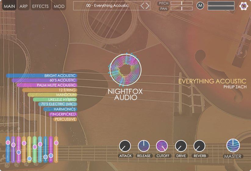 Everything Acoustic is a stack of 10 unique acoustic instruments, recorded meticulously over the entire fretboard. Acoustic guitar, Mandolin, Ukulele, Baritone Ukulele, Fingerpicked Acoustic, 12 String, and more. It feels authentic, with fretbuzz and sonic irregularities intact, it’s real instruments in real spaces with all the functionality of a synthesizer with full effects.