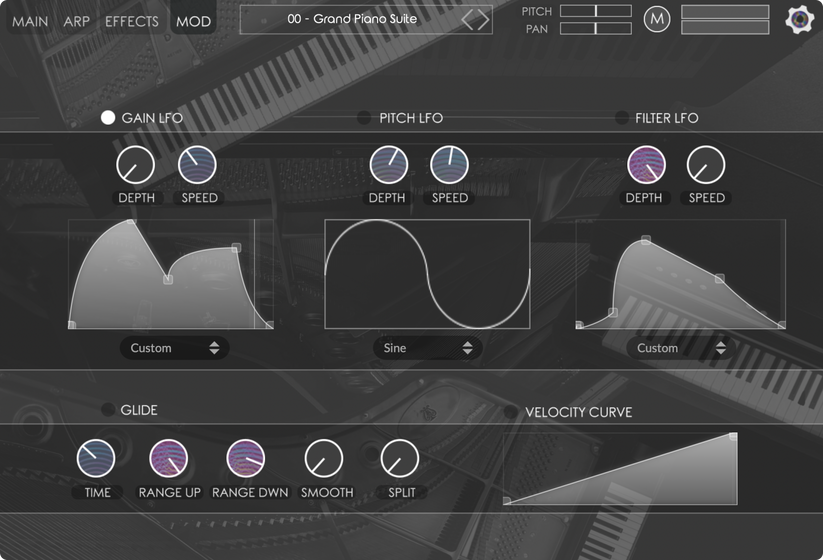 - 3 LFO’s (Gain LFO, Pitch LFO, and Filter LFO) with 6 shape options