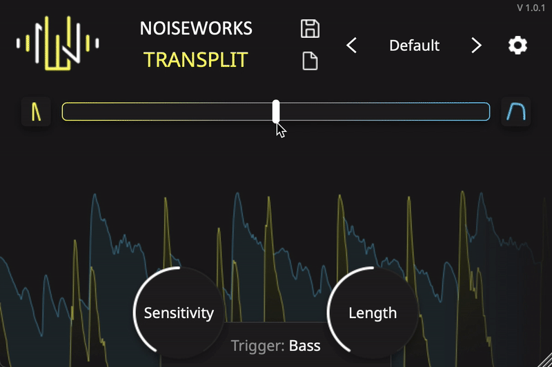 The slider determines the volume balance between Punch and Body. Sensitivity controls how detailed the dynamics are captured. Length sets the fade-out of the detected transients (yellow), and Trigger allows a frequency focus to be established. This way, the focus can be shifted more towards the kick or more towards the crashes.