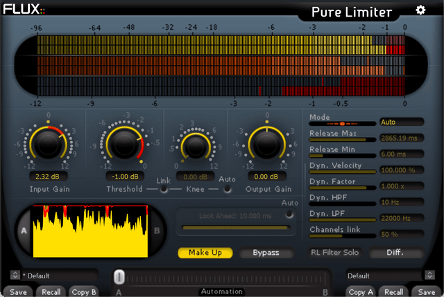Full control over the processing - In addition to the common controls on a limiter; Input, Output, Threshold and Knee, Pure Limiter offers control over the fundamental characteristics of the processing, all in order to provide full control over the processing even in the most demanding situations.