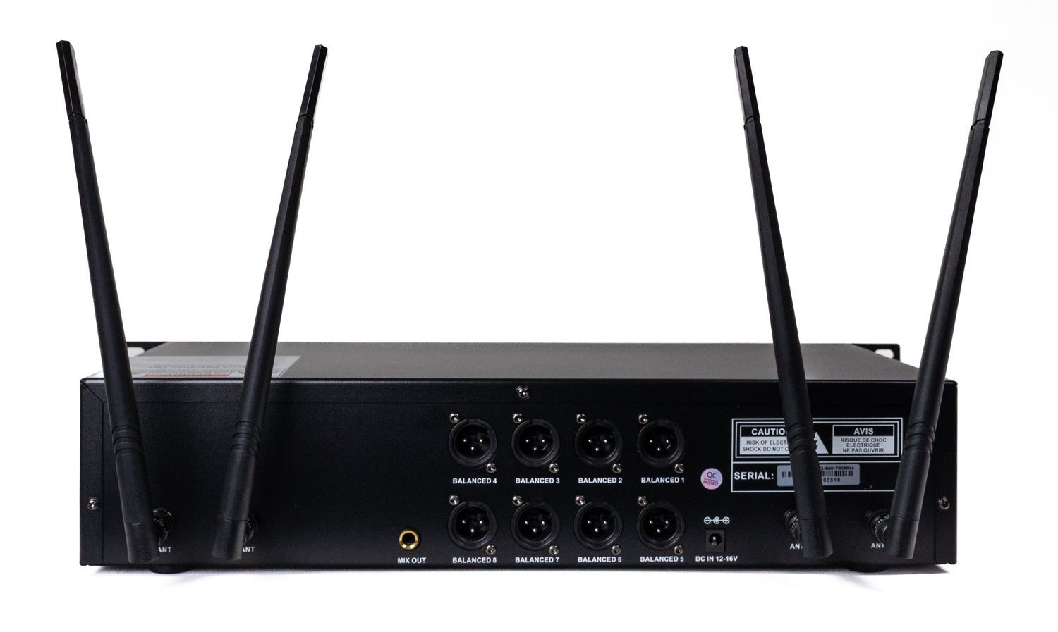 - Consists of 8 tabletop microphone transmitters and a single receiver in a rack unit.